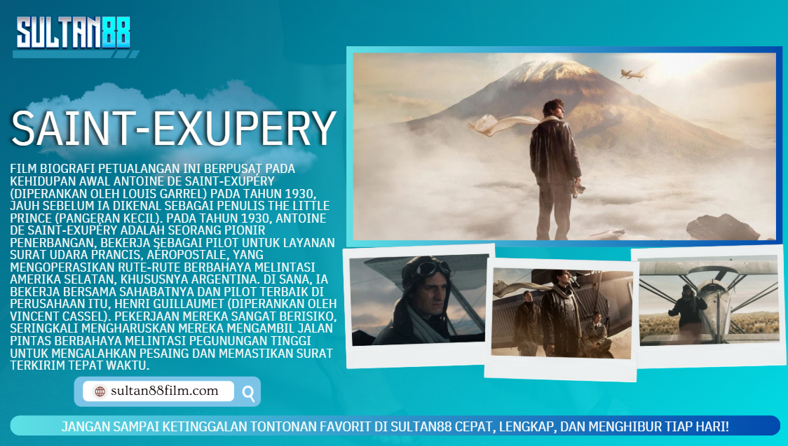 Nikmati film favoritmu di SULTAN88 Film biografi petualangan ini berpusat pada kehidupan awal Antoine de Saint-Exupéry (diperankan oleh Louis Garrel) pada tahun 1930, jauh sebelum ia dikenal sebagai penulis The Little Prince (Pangeran Kecil).