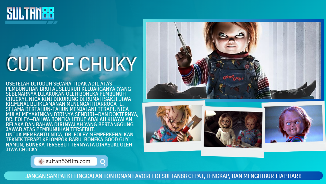 Nonton Santai dan nikmati film favoritmu di SULTAN88. Cult of Chucky melanjutkan kisah Nica Pierce (diperankan oleh Fiona Dourif) empat tahun setelah peristiwa Curse of Chucky (2013).