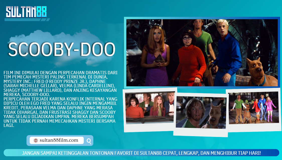 Nonton Santai dan nikmati film favoritmu di SULTAN88 Film ini dimulai dengan perpecahan dramatis dari tim pemecah misteri paling terkenal di dunia, Mystery Inc.: Fred (Freddy Prinze Jr.), Daphne (Sarah Michelle Gellar), Velma (Linda Cardellini), Shaggy (Matthew Lillard), dan anjing kesayangan mereka, Scooby-Doo.